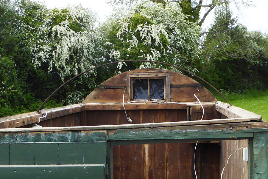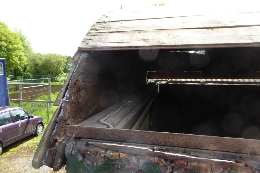 Each end a solid wooden arch was bolted to the top plate in line with the centre hoop, these arches will have to be replaced. This was clad with tongue and groove then covered with corrugated iron, which is also being replaced.